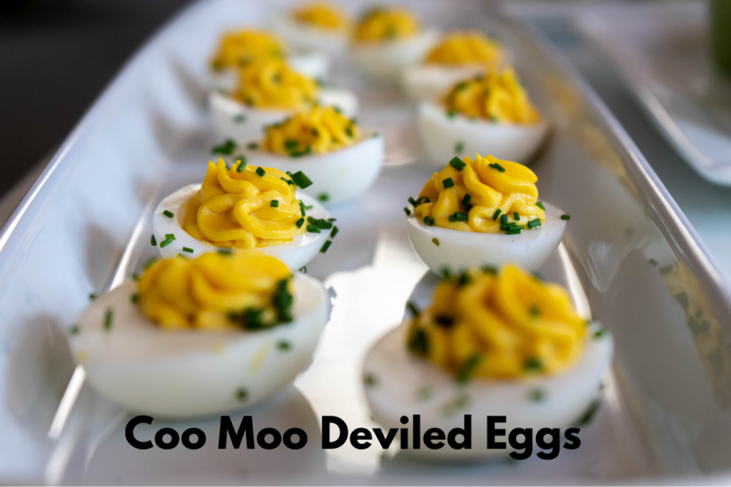 4.To garnish the deviled eggs, add a sprinkle of paprika and top with minced chives. For something fun add a dollop of Coo Moo Apricot Habanero or Coo Moo Peachy Mango Madness on top. Deviled eggs can be served at room temperature or chilled.
